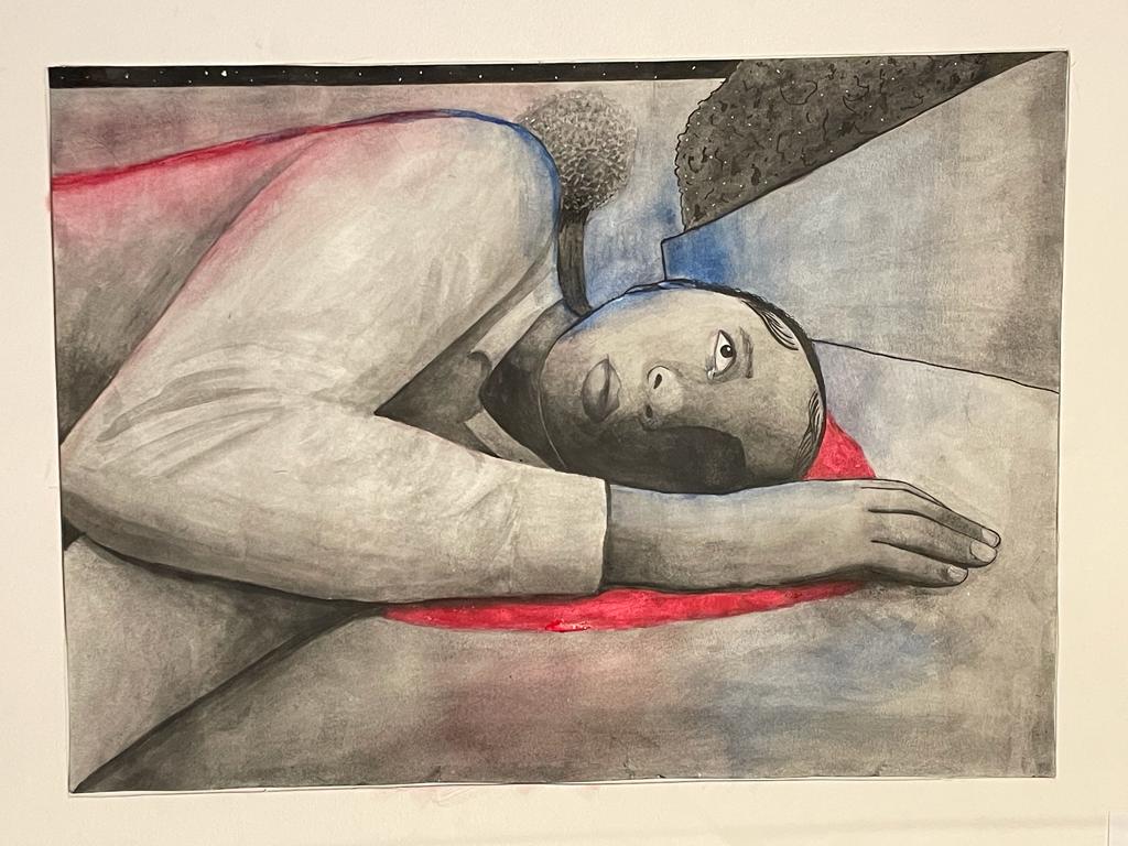 Description: This painting is inspired by global violence. Specifically violence committed by people in authoritative roles. The piece is black and white, except for the use of red, which represents blood, and the blue and red for police car lights.