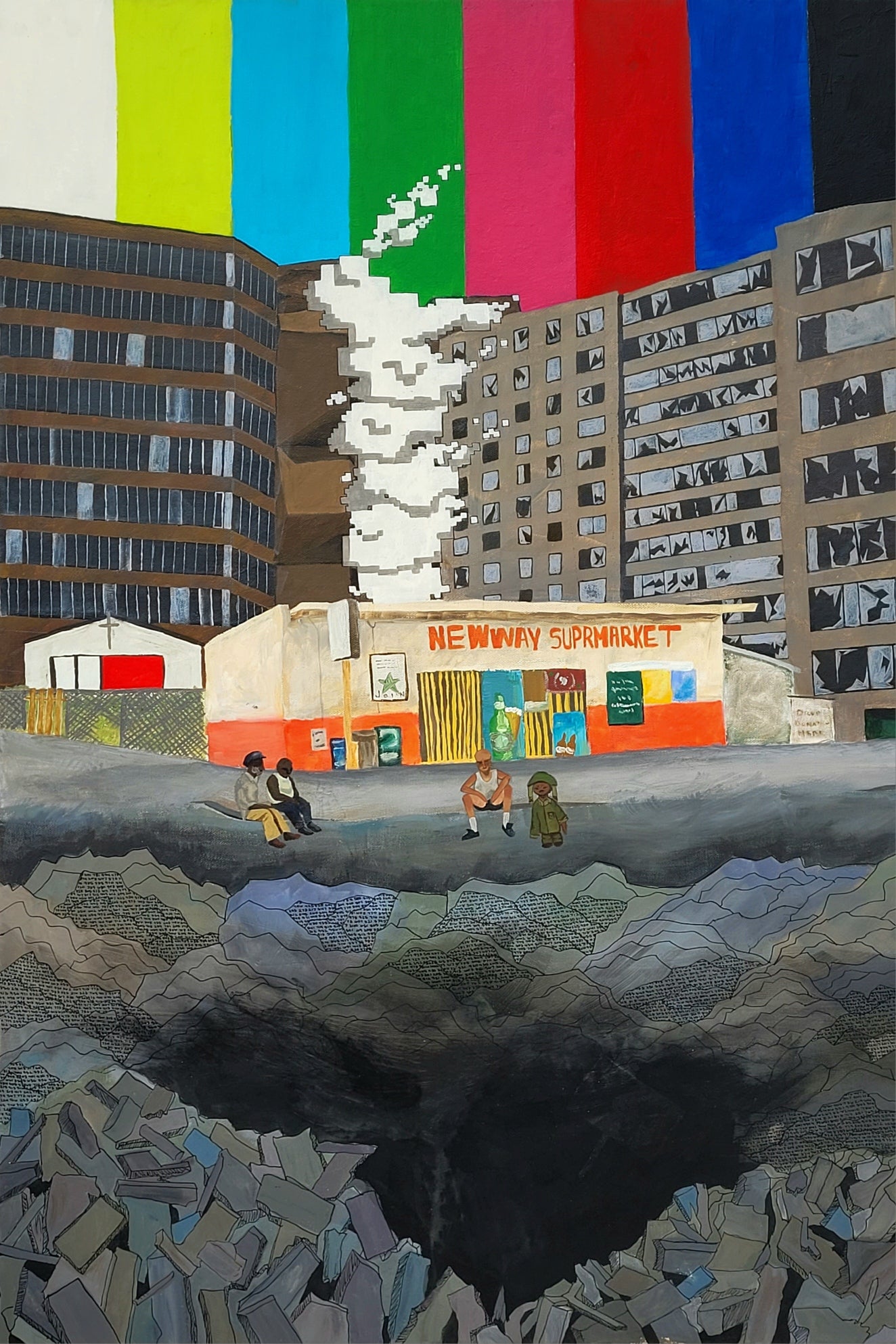 Description: A painting which aims to depict the commonality of poverty within the U.S. and how it harms those in its grasp, as well as how we as the viewer participate in this due to our willful ignorance, perpetuated by media and news depictions which aim to distract us.