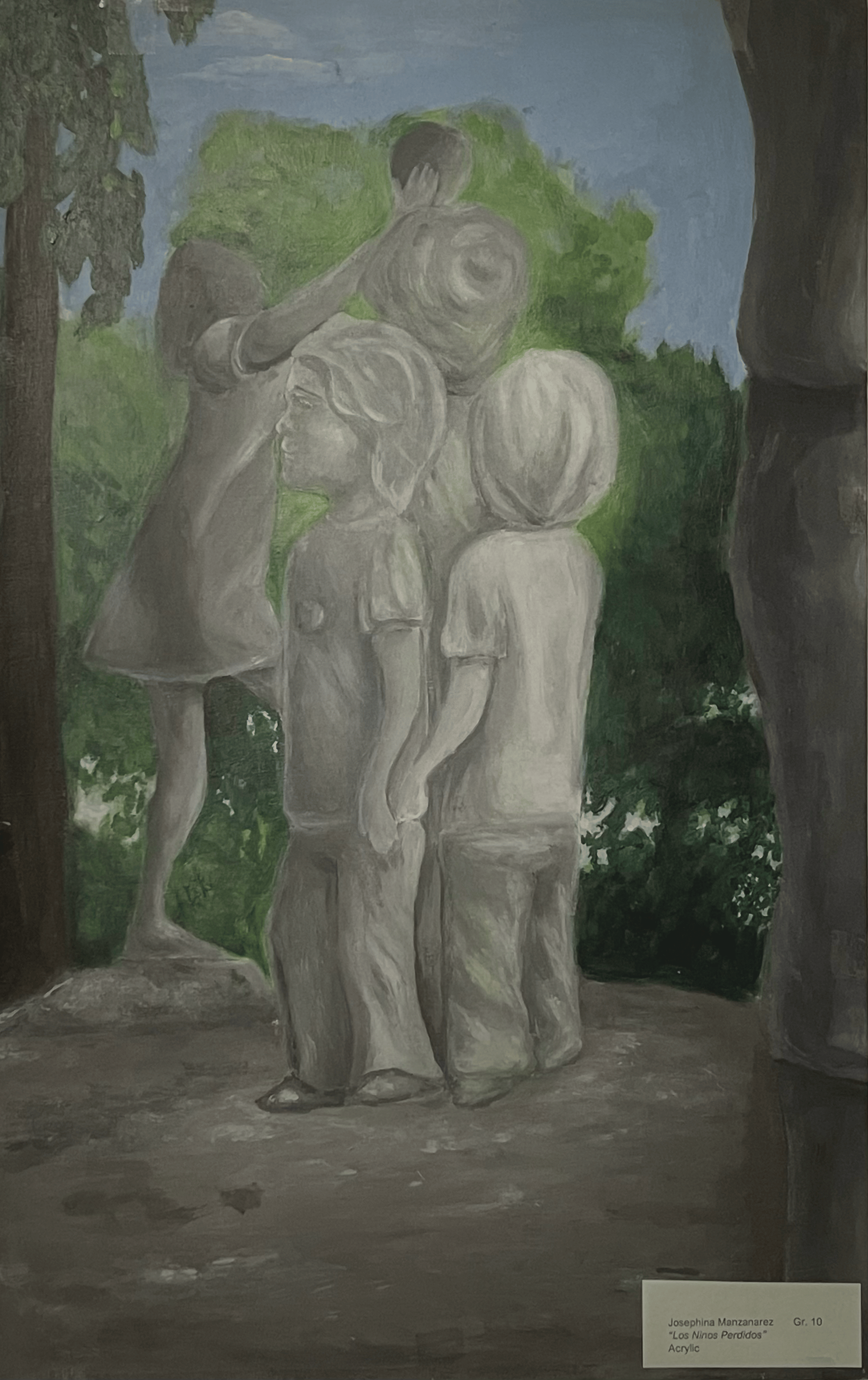 Description: This painting is inspired by disappearances and kidnapping of children at Nicaraguan Park. It features statues in honor of said children, highlighting the global issue of child abductions and disappearances.