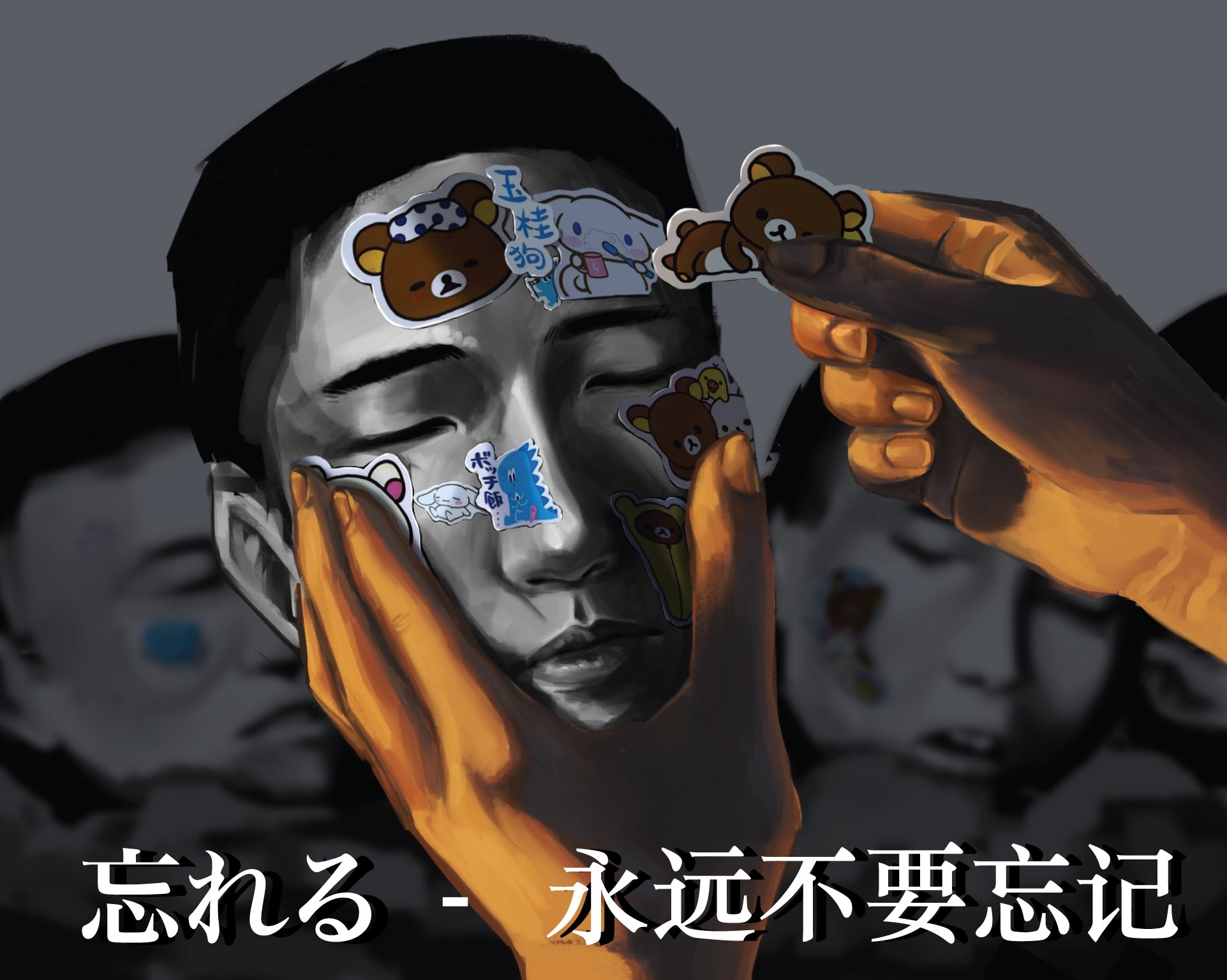 Description: This painting highlights the way Japan used soft power to mask its war crimes in WWII. This piece shows the victims of the Nanjing Massacre with a hand covering their faces with stickers to cover up their crimes. It says “forget” in Japanese and “never forget” in Chinese.