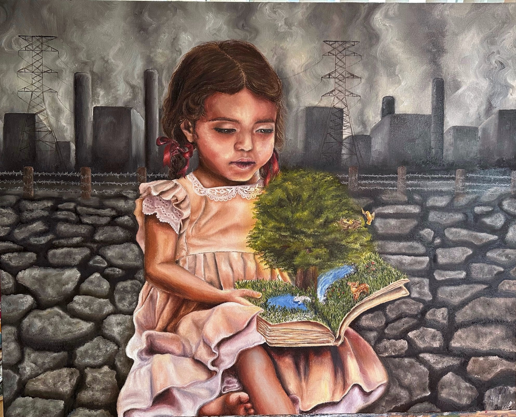 Description: This painting strives to depict the horror of the world where nature is lost for us forever and can only be seen in books. This piece is meant to bring awareness to the devastating irreversible consequences of climate change.